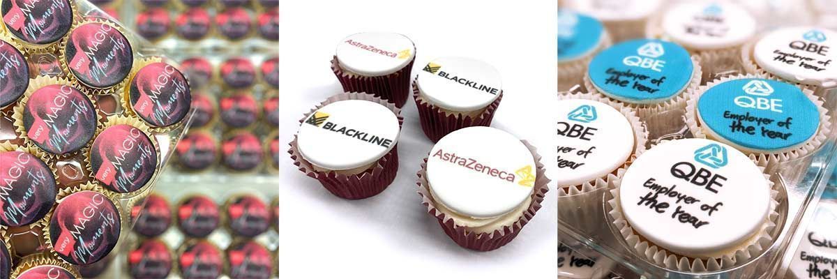 Use our cupcakes as the base to create your own mini corporate Hampers! These thoughtful corporate gift ideas make perfect bespoke corporate cupcake packages for clients and customers and make a very unique gift! As they are much smaller, each box starts from £19.99 including delivery and is filled with your branded goods, including logo cups, brand coasters and best of all; your corporate image on the cupcakes!