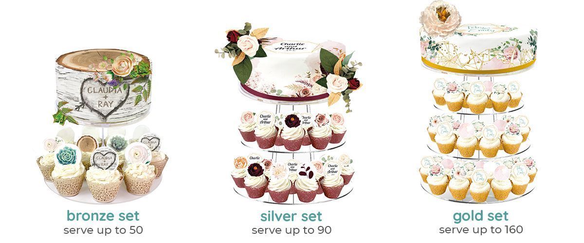 The wedding cake is the centrepiece to any reception and getting it right can be a major challenge to any cake decorator. Fortunately, bakerdays is on hand to supply you with your perfect cake for your perfect day. We cater from the traditional white cake, to the more contemporary brushed rose gold cakes. Our Wedding cakes are now in full swing, ready for you to order with a few clicks; and straight to your venue. Pick from our bronze set which serves 50, our silver set which serves 90 or our gold set that serves 160 guests!